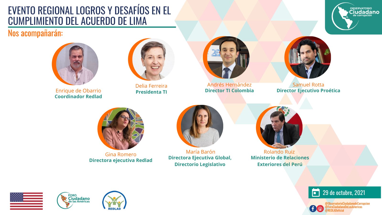 Además, el evento virtual permitió generar la reflexión sobre la lucha anticorrupción de la región, mediante las ponencias magistrales de la Presidenta de Transparencia Internacional, Delia Ferreira Rubio y la intervención de Enrique de Obarrio, Coordinador General de la Red Latinoamericana y del Caribe para la Democracia (Redlad).