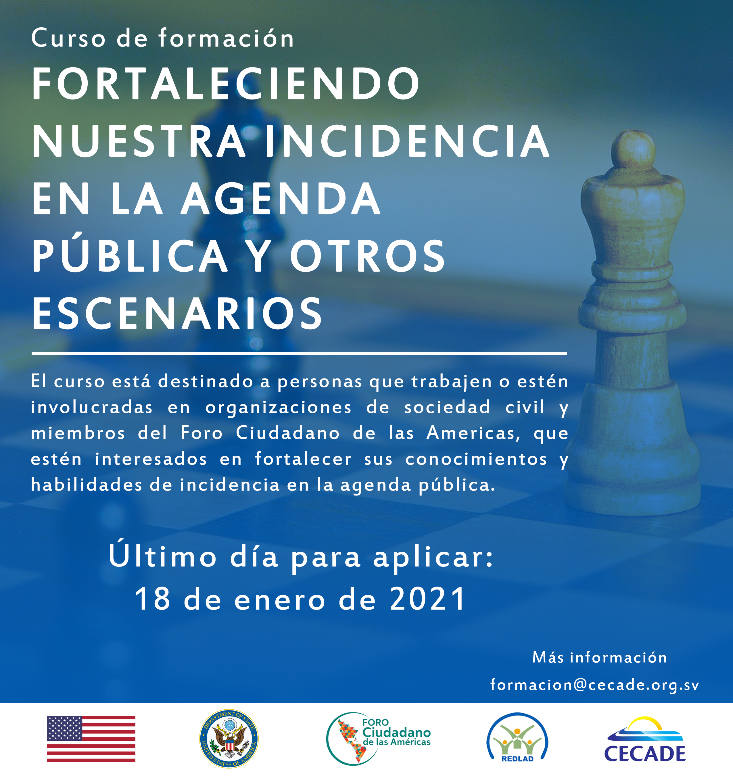 La Red Latinoamericana y del Caribe para la Democracia -REDLAD-, y el Centro de Capacitación y Promoción de la Democracia -CECADE-, invita atentamente a las organizaciones del Foro Ciudadano de las Américas -FCA-, a tomar parte del presente curso de formación “Fortaleciendo nuestra incidencia en la agenda pública y otros escenarios”.
